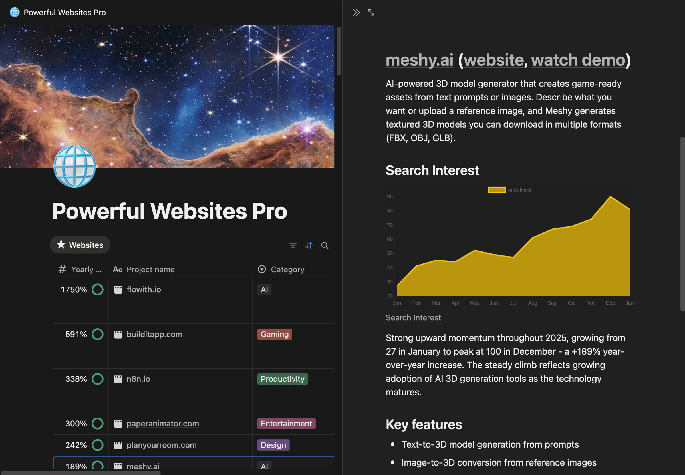 Welcome to this week’s Powerful Websites. In this issue: Gamma (productivity), MapGenie (gaming), plus this week’s Pro Website deep-dive. Have feedback? Just reply. Let’s get into it. Gamma (website, watch demo)Presentations are a universal pain point. Everyone needs them, nobody enjoys making them. Gamma removes the grunt work by generating first drafts that actually look good. The rise of AI tools has made “I need slides for tomorrow” go from a crisis to a 10-minute task. What’s next: Gamma is part of the AI Productivity Tools trend. We’re seeing AI handle more of the repetitive work in knowledge jobs - presentations, documents, spreadsheets. Tools that generate good first drafts are becoming essential for anyone who works with information. Beautiful.ai, Tome, Canva, and Plus AI are other tools in this space. MapGenie (website, watch demo)Open-world games keep getting bigger. Elden Ring has 400+ items. Zelda TOTK has 1000+ locations. Completionists need help tracking what they’ve found and what’s left. MapGenie fills the gap between “I want 100%” and “I don’t want to spend 200 hours searching.” What’s next: MapGenie is part of the Gaming Companion Tools trend. As games become more complex, players increasingly rely on external tools to enhance their experience. Interactive maps, build planners, and wiki companions are seeing steady growth alongside the games they support. Fextralife, IGN Maps, game8.co, and game-specific wikis are other tools in this space. This Week’s Pro WebsiteThis week’s Pro Website is an Education tool that grew +550% this year. It’s an interactive 3D platform used by medical schools and healthcare organizations. Pro members get the full breakdown. “I got tired of researching the same things over and over.”Rj Bernaldo So I started documenting everything. Pricing, alternatives, what’s actually good vs overhyped. Each website I feature is already listed on the Free Spreadsheet but members get my verified breakdowns: pricing, alternatives, and honest verdicts, all documented in a separate Pro Spreadsheet showcased below. If you want to stay ahead of the curve, join Powerful Websites Pro today.